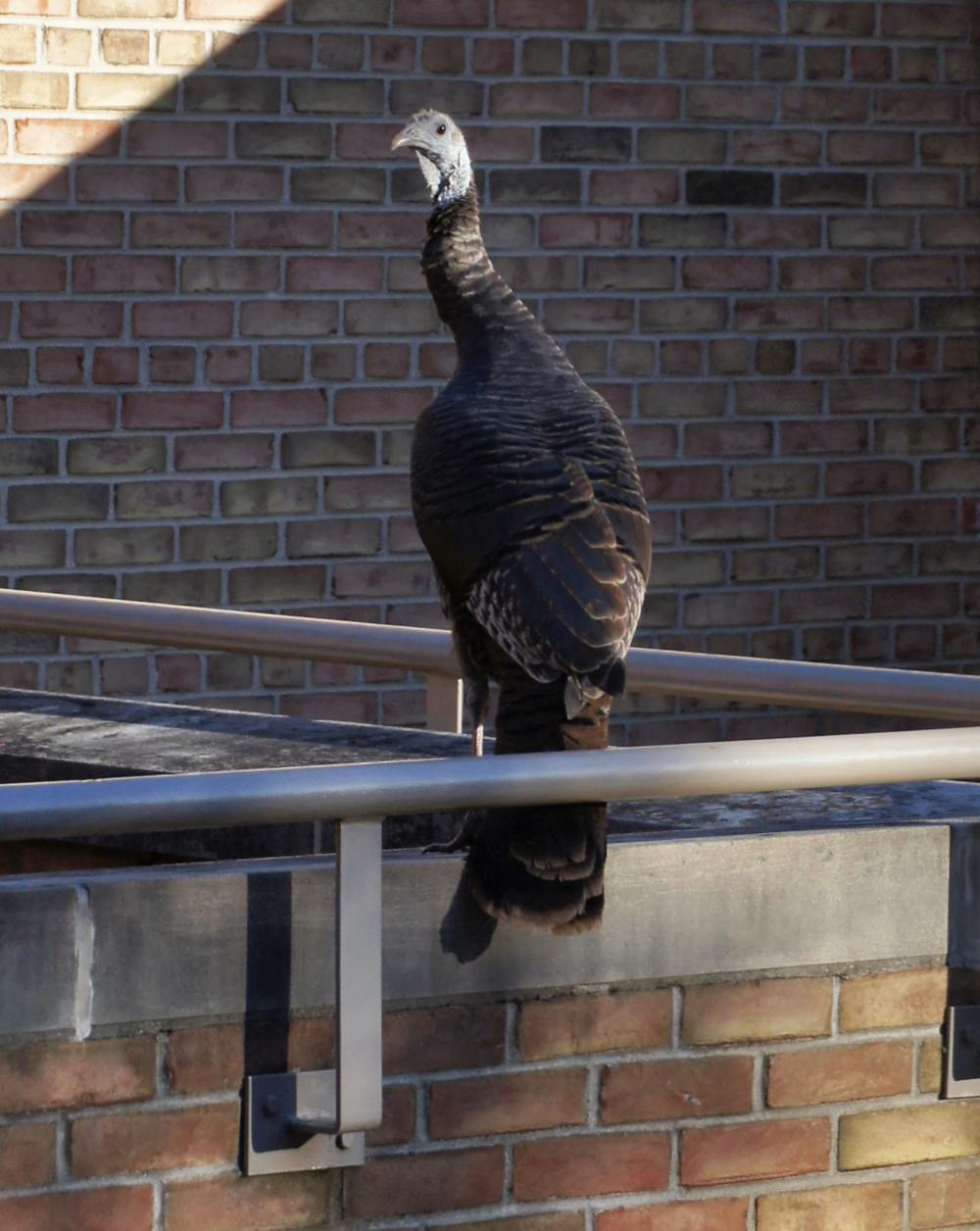 This wild turky landed breifly on my third-floor balcony. With a max speed around 90 km/hr, she's no butterball.